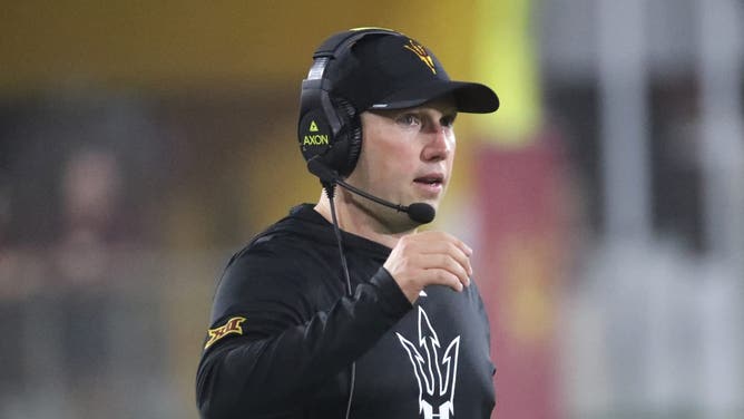 TEMPE, ARIZONA - AUGUST 30: Head coach Kenny Dillingham of the Arizona State Sun Devils communicates with his coaches on his headset during a timeout in the Northern Arizona University Lumberjacks versus the Arizona State University Sun Devils football game at Mountain America Stadium on August 30, 2025 in Tempe, Arizona. (Photo by Bruce Yeung/Getty Images)