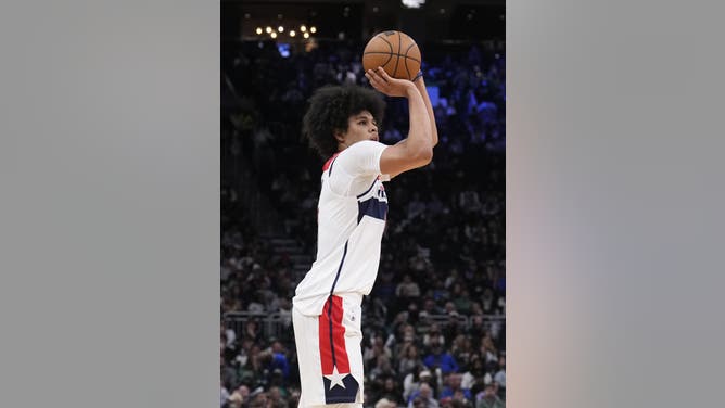 Oct 22, 2025; Milwaukee, Wisconsin, USA; Washington Wizards forward Kyshawn George (18) puts up a shot against the Milwaukee Bucks in the second hallf at Fiserv Forum. Mandatory Credit: Michael McLoone-Imagn Images