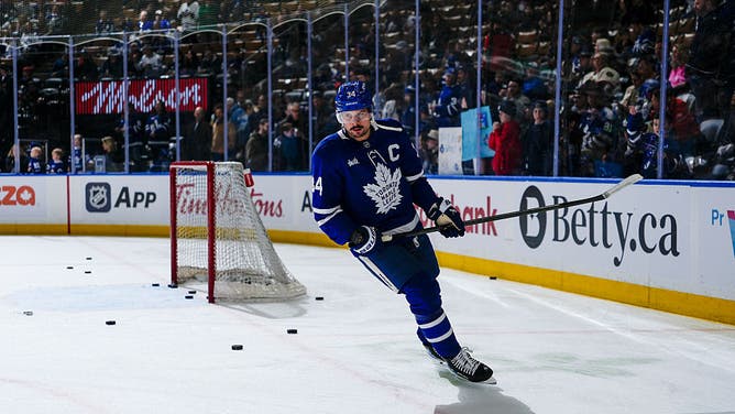 TORONTO, CANADA - FEBRUARY 28: Auston Matthews #34 of the Toronto Maple Leafs warms-up before facing the Ottawa Senators at the Scotiabank Arena on February 28, 2026 in Toronto, Ontario, Canada. (Photo by Mark Blinch/NHLI via Getty Images)