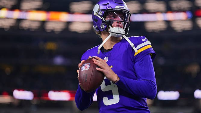 ARLINGTON, TX - DECEMBER 14: J.J. McCarthy #9 of the Minnesota Vikings warms up before kickoff against the Dallas Cowboys during an NFL football game at AT&T Stadium on December 14, 2025 in Arlington, Texas. (Photo by Cooper Neill/Getty Images)
