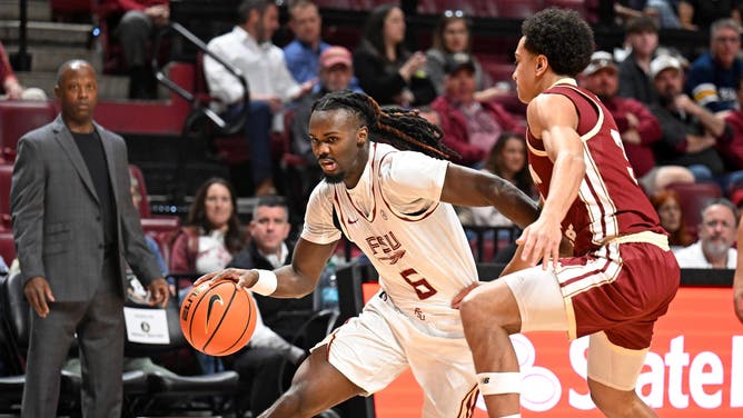 Feb 17, 2026; Tallahassee, Florida, USA; Florida State Seminoles guard Robert McCray (6) dribbles the ball to the net during the first half against the Boston College Eagles at Donald L. Tucker Center. Mandatory Credit: Melina Myers-Imagn Images