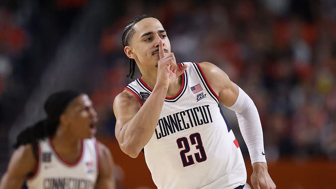 INDIANAPOLIS, INDIANA - APRIL 04: Jayden Ross #23 of the UConn Huskies gestures while playing against the Illinois Fighting Illini in the first half of the Final Four of the 2026 NCAA Men's Basketball Tournament at Lucas Oil Stadium on April 04, 2026 in Indianapolis, Indiana. (Photo by Patrick Smith/Getty Images)