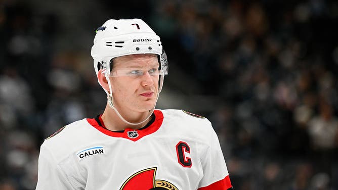 SALT LAKE CITY, UTAH - JANUARY 07: Brady Tkachuk #7 of the Ottawa Senators looks on during a game against the Utah Mammoth at Delta Center on January 07, 2026 in Salt Lake City, Utah. (Photo by Alex Goodlett/Getty Images)