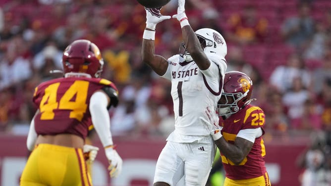 Aug 30, 2025; Los Angeles, California, USA; Missouri State Bears wide receiver Dash Luke (1) catches the ball against Southern California Trojans cornerback Marcelles Williams (25) and linebacker Matai Tagoa'i (44) in the second half at United Airlines Field at Los Angeles Memorial Coliseum. Mandatory Credit: Kirby Lee-Imagn Images