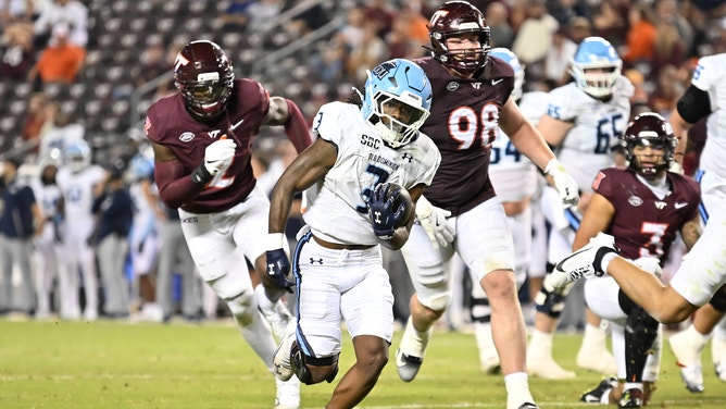 Sep 13, 2025; Blacksburg, Virginia, USA; Old Dominion Monarchs running back Devin Roche (3) runs for a touchdown during the fourth quarter at Lane Stadium. Mandatory Credit: Brian Bishop-Imagn Images