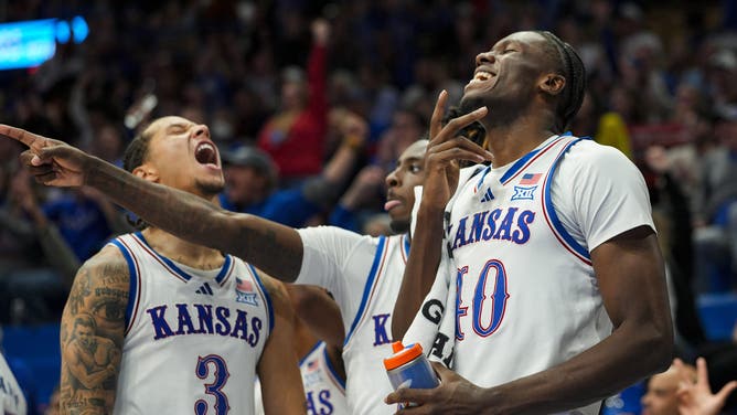 Nov 3, 2025; Lawrence, Kansas, USA; Kansas Jayhawks forward Flory Bidunga (40) and guard Tre White (3) and guard Jamari McDowell (11) celebrate during the second half against the Green Bay Phoenix at Allen Fieldhouse. Mandatory Credit: Jay Biggerstaff-Imagn Images