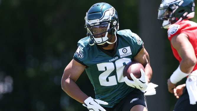 May 30, 2024; Philadelphia, PA, USA; Philadelphia Eagles running back Saquon Barkley (26) runs with the ball during practice at NovaCare Complex. Mandatory Credit: Bill Streicher-USA TODAY Sports