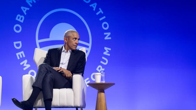 Barack Obama with very aggressive leg crossing during an event in 2024. (Photo by Scott Olson/Getty Images)