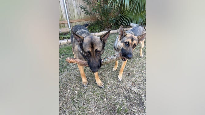 Sarge 99# and baby sister Mabel 68# playing tug-o-war.