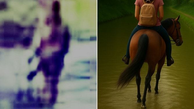 This is actually a girl riding a horse away from the camera… photo on left is the actual photo with higher contrast and the photo on the right is an a.i. generated photo just so folks can understand what’s actually happening in the left photo.