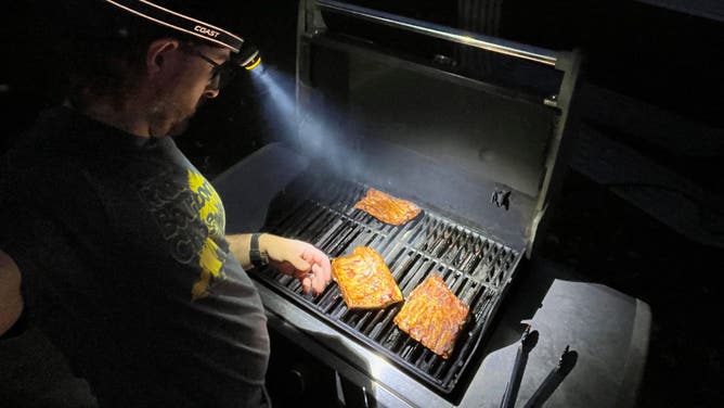 As I mentioned in SC today, my dad died this past Tuesday. He was truly a grill master and everything I learned was from him. Grilling has become a way of life for me and my family. Never stopping no matter what. We (in the royal "we" sense) grill in the dark. We grill in the rain. We grill in below freezing temps. So on my first night back in Indy, here I am grilling by head lamp which is no surprise. Hope you are having a good night!