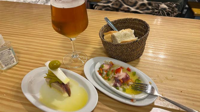 This is a $9.50 meal, including the beer, in San SebastiƔn, Spain