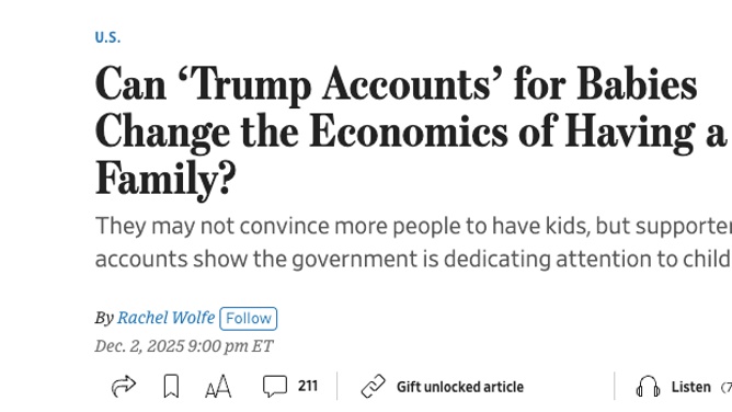 From the WSJ: "The money can’t generally be tapped until a child turns 18 at the earliest, so it won’t offer what parents say they need most: financial help while their children are young. Yet the policy’s supporters say the accounts are a step in the right direction, and could help shift thinking around family formation on the whole."