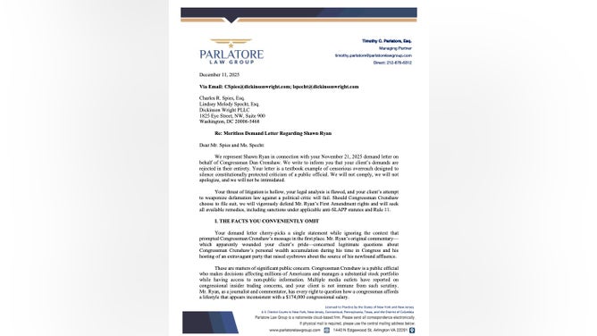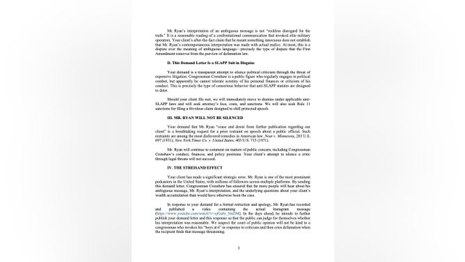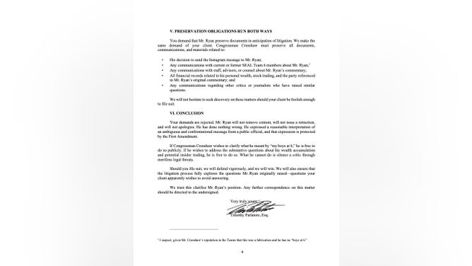 "Mr. Ryan’s original commentary— which apparently wounded your client’s pride—concerned legitimate questions about Congressman Crenshaw’s personal wealth accumulation during his time in Congress and his hosting of an extravagant party that raised eyebrows about the source of his newfound affluence. These are matters of significant public concern. Congressman Crenshaw is a public official who makes decisions affecting millions of Americans and manages a substantial stock portfolio while having access to non-public information. Multiple media outlets have reported on congressional insider trading concerns, and your client is not immune from such scrutiny. Mr. Ryan, as a journalist and commentator, has every right to question how a congressman affords a lifestyle that appears inconsistent with a $174,000 congressional salary."