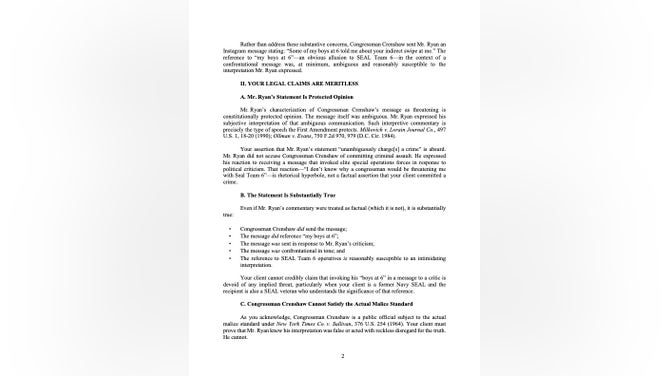 Parlatore also wrote, "Rather than address these substantive concerns, Congressman Crenshaw sent Mr. Ryan an Instagram message stating: "Some of my boys at 6 told me about your indirect swipe at me." The reference to "my boys at 6"—an obvious allusion to SEAL Team 6—in the context of a confrontational message was, at minimum, ambiguous and reasonably susceptible to the interpretation Mr. Ryan expressed."