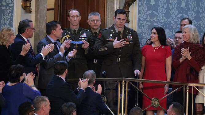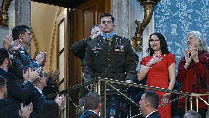 U.S. Army Chief Warrant Officer Eric Slover receives the Medal of Honor during President Donald Trump's State of the Union address in the House Chamber of the U.S. Capitol on Tuesday, February 24, 2026. Slover was wounded in the January 2026 mission to capture Venezuelan leader Nicolás Maduro. (Tom Williams/CQ-Roll Call, Inc via Getty Images)