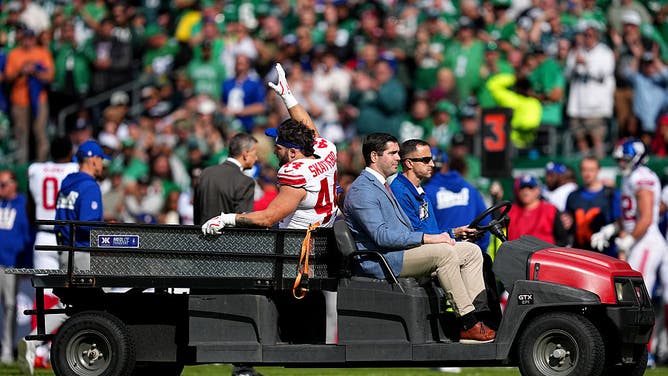 Cam Skattebo carted off the field during game against the Philadelphia Eagles at Lincoln Financial Field. (Photo by Mitchell Leff/Getty Images)