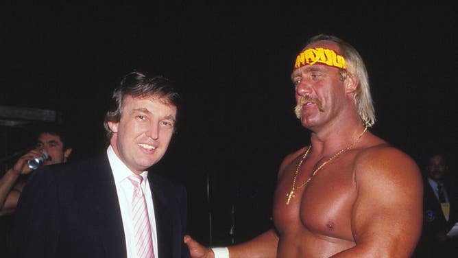 Donald Trump and World Champion Wrestler Hulk Hogan at Wrestlemania Vl Convention Hall in Atlantic City in 1987. (Photo by Jeffrey Asher/ Getty Images)