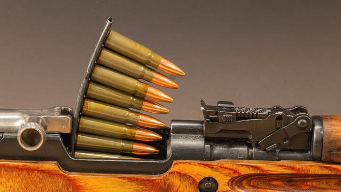 A close-up view of a classic semi-automatic rifle with a stripper clip loaded with rifle cartridges. (Credit: Getty Images Creatives)