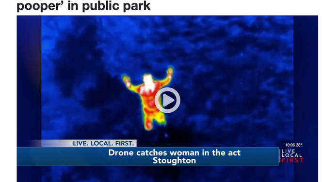 SPD USES DRONE TO ARREST SERIAL DEFECATOR IN CITY PARK: After multiple reports of residents finding human feces and used toilet paper in a city park, SPD used trail cameras and a drone to ID and cite the person responsible. Early this morning one of our drone operators used a drone to monitor a city park after SPD trail cameras established a pattern of a person defecating in the park during early morning hours. SPD officers made contact and cited a 46 year old female Stoughton resident after the drone recorded her defecating in the park this morning. The female was cited for Indecent Conduct.