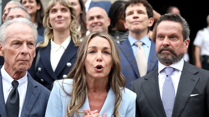 Karen Read greets her supporters after she is acquitted on many of the charges against her on June 18. (Staff Photo By Stuart Cahill/Boston Herald via Getty Images)