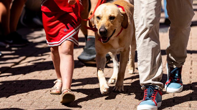 Ole Miss head coach Lane Kiffin’s dog Juice participates in the Walk of Champions before a college football game between Ole Miss and LSU at Vaught-Hemingway Stadium in Oxford, Miss., on Saturday, Sept. 27, 2025. © Ayrton Breckenridge/Clarion Ledger / USA TODAY NETWORK via Imagn Images