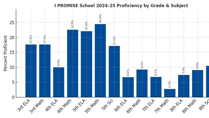 (State data show just a fraction of I PROMISE School students scoring proficient in reading, math, and science for the 2024–25 school year, with many grade levels posting single-digit or low-teens results. / via Ohio Department of Education)