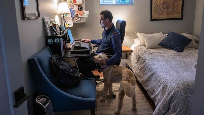 Danny Crouch pets his dog as he sits in his basement working from home in Arlington, Virginia, on May 25, 2023. The pandemic forced Americans to work from home. And now, more than three years on, employers are struggling to bring them back to the office. A third of employees in the US currently have complete freedom about where they work, compared with just 18 percent in France, according to a recent ADP study of 17 countries. (Photo by ANDREW CABALLERO-REYNOLDS / AFP) (Photo by ANDREW CABALLERO-REYNOLDS/AFP via Getty Images)