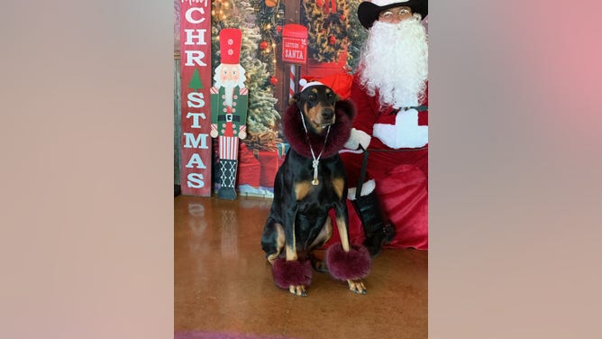 Jeff M. Writes: Here is my wife's vicious Doberman posing with Santa. Merry Christmas!!!