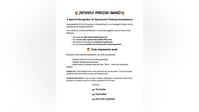 When I came across a car that parked "stupidly" I would take the time to write them a simple "Jackhole Parking" note on a piece of paper. Then I printed out fliers to put on their windshields. Then I realized I had too much time on my hands, but it does burn me when I see someone park like a...yep, a jackhole. Attached is a PDF for your readers to print out and have them in their cars to spread the kind word to our ill parking brethren.
