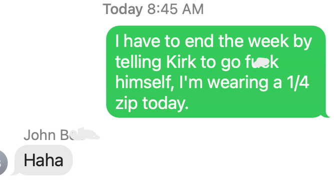 I think Paul just called me a pussy for not telling Canoe Kirk to go ‘f--k himself’ for his ¼ zip rant in the group text