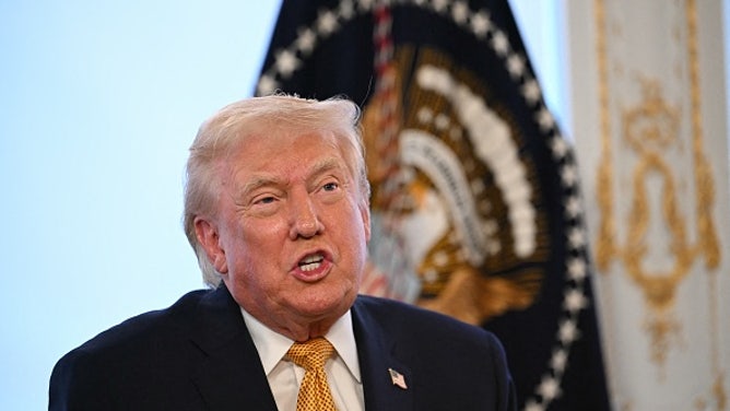 US President Donald Trump participates in calls to US service members, on Christmas Eve, from the Mar-a-Lago club in Palm Beach, Florida, December 24, 2025. (Photo by ANDREW CABALLERO-REYNOLDS / AFP via Getty Images)