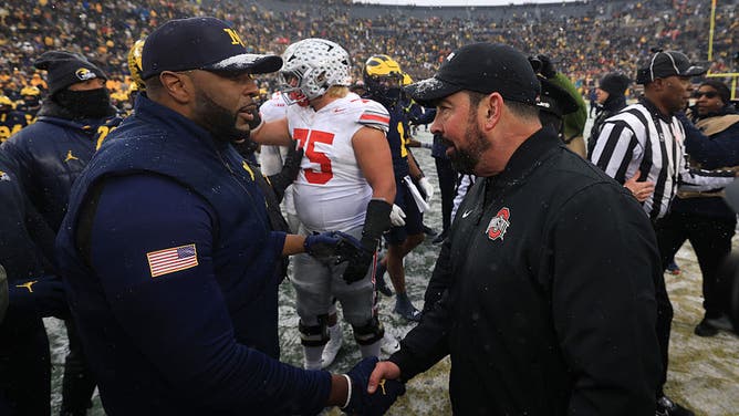 ANN ARBOR, Mich. - Head coaches Ryan Day of the Ohio State Buckeyes and Sherrone Moore of the Michigan Wolverines shake hands after their game at Michigan Stadium on November 29, 2025. (Photo by Gregory Shamus/Getty Images)