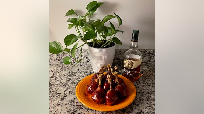 Rain for over 2 days, so I thought I would experiment indoors with Bacon Wrapped BBQ Chicken Lollipops. They were a little labor intensive, but well worth it! Goes well with Buffalo Trace…duh.