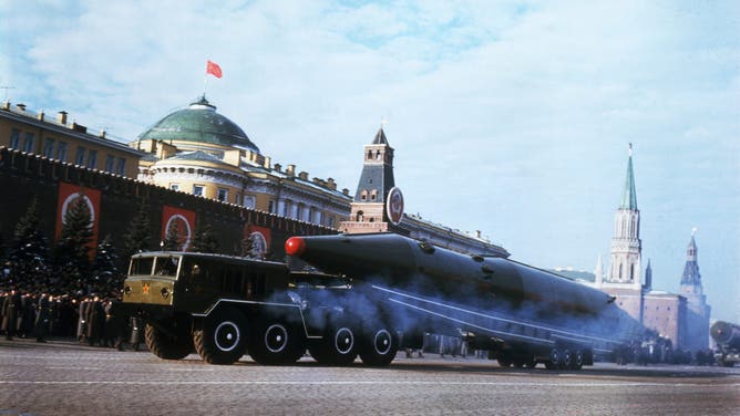 A Soviet ballistic missile rolls by the Kremlin during a parade celebrating the 50th anniversary of the Bolshevik Revolution. (Credit: Getty Images)