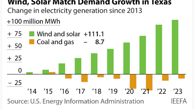 Note the second chart showing the growth of green energy in Texas over the same years. Coincidence?