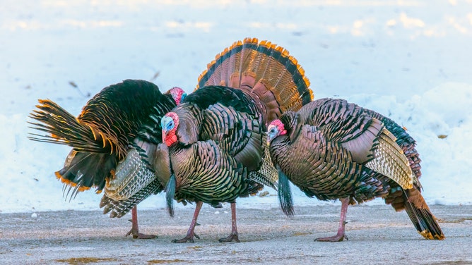 Wild turkey males in winter. (Via Getty Images)
