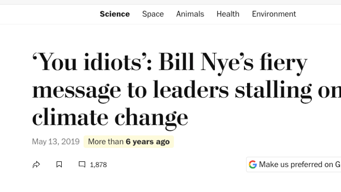Meanwhile, the Post archive has NUMEROUS stories where Nye is screaming about how the planet is burning up. "Yes, you should listen to Bill Nye instead of Sarah Palin on climate change," the Post said in a 2016 headline. I don't know if Palin was much of a scholar on climate change, but at least she wasn't a fraud screaming about climate change while being a big fan of gas stoves like Nye.
