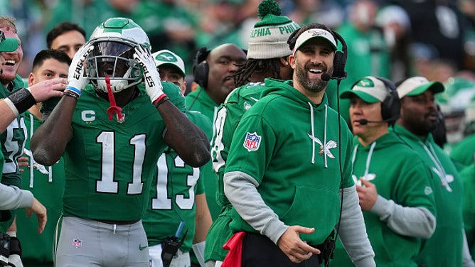PHILADELPHIA, PENNSYLVANIA - DECEMBER 29: A.J. Brown #11 of the Philadelphia Eagles and head coach Nick Sirianni react against the Dallas Cowboys at Lincoln Financial Field on December 29, 2024 in Philadelphia, Pennsylvania. (Photo by Mitchell Leff/Getty Images)