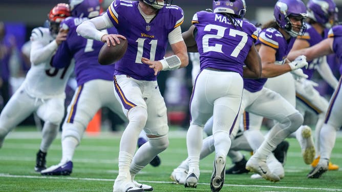 Minnesota Vikings quarterback Carson Wentz (11) scrambles to throw in the first quarter of the NFL Week 3 game between the Minnesota Vikings and the Cincinnati Bengals at U.S. Bank Stadium in Minneapolis on Sunday, Sept. 21, 2025.