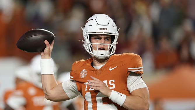 AUSTIN, TEXAS - NOVEMBER 28: Arch Manning #16 of the Texas Longhorns warms up prior to a game against the Texas A&M Aggies at Darrell K Royal-Texas Memorial Stadium on November 28, 2025 in Austin, Texas. (Photo by Alex Slitz/Getty Images)