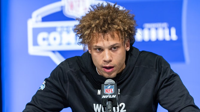 INDIANAPOLIS, INDIANA - MARCH 01: Jermaine Burton #WO02 of the Alabama Crimson Tide speaks to the media during the 2024 NFL Draft Combine at Lucas Oil Stadium on March 01, 2024 in Indianapolis, Indiana. (Photo by Michael Hickey/Getty Images)