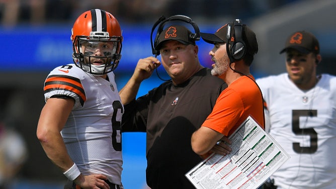 Baker Mayfield talks with former offensive coordinator Alex Van Pelt and head coach Kevin Stefanski. (Photo by John McCoy/Getty Images)