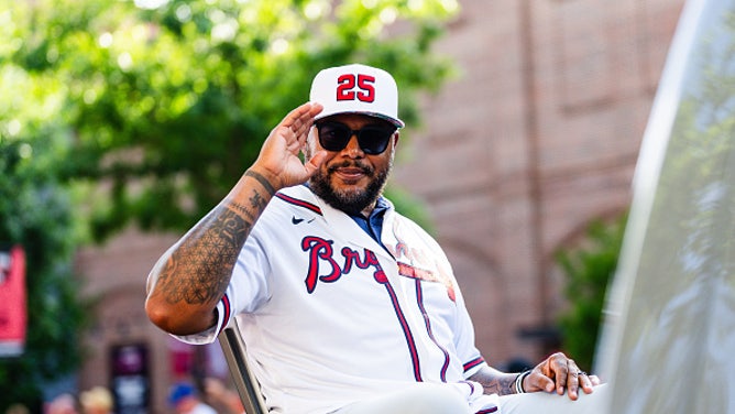 Andruw Jones is recognized during the Atlanta Braves pregame Legends Parade. (Photo by Matthew Grimes Jr./Atlanta Braves/Getty Images)