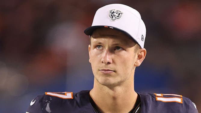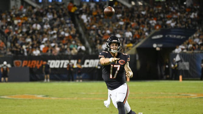CHICAGO - Tyson Bagent of the Chicago Bears looks on against the Buffalo Bills during the NFL Preseason 2025 game between Buffalo Bills and Chicago Bears at Soldier Field on August 17, 2025. (Photo by Michael Reaves/Getty Images)