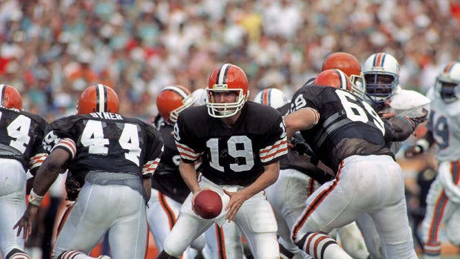 Jan 4, 1986; Miami, FL, USA; FILE PHOTO; Cleveland Browns quarterback (19) Bernie Kosar looks to hand off against the Miami Dolphins in the 1985 AFC Divisional Playoff game at the Orange Bowl. The Dolphins defeated the Browns 24-21. Mandatory Credit: Photo By Manny Rubio-USA TODAY Sports © Copyright Manny Rubio