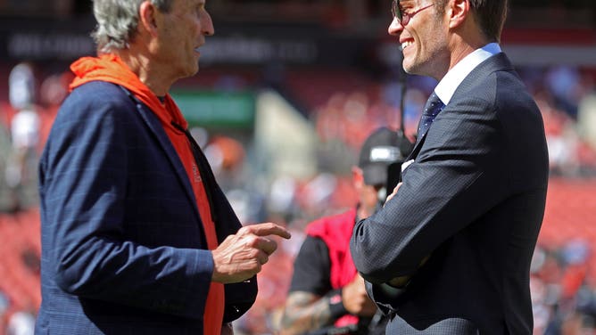 Former Browns quarterback Bernie Kosar, left, chats with former NFL quarterback Tom Brady before an NFL football game at Huntington Bank Field, Sunday, Sept. 8, 2024, in Cleveland, Ohio.