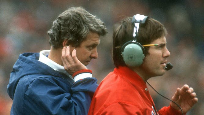 New York Giants head coach Bill Parcells and defensive coordinator Bill Belichick on the sideline in a 21-0 loss to the San Francisco 49ers in the 1984 NFC Divisional Playoff Game at Candlestick Park, in San Francisco, California. (Photo by Arthur Anderson/Getty Images)