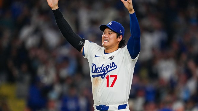 LOS ANGELES, CA - OCTOBER 27: Shohei Ohtani #17 of the Los Angeles Dodgers celebrates after defeating the Toronto Blue Jays in Game Three of the 2025 World Series presented by Capital One at Dodger Stadium on Monday, October 27, 2025 in Los Angeles, California. (Photo by Mary DeCicco/MLB Photos via Getty Images)
