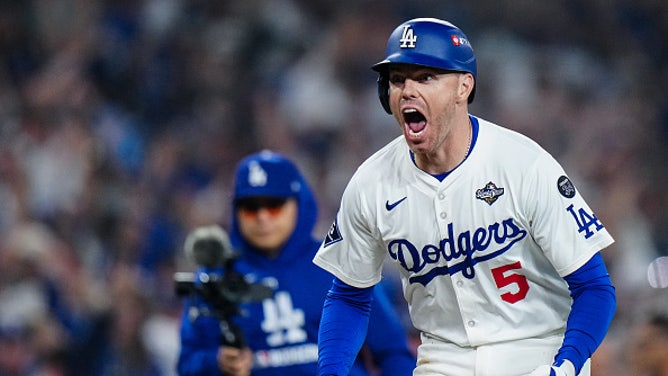 LOS ANGELES, CA - OCTOBER 27: Freddie Freeman #5 of the Los Angeles Dodgers reacts after hitting a walk-off home run in the 18th inning of Game Three of the 2025 World Series presented by Capital One between the Toronto Blue Jays and the Los Angeles Dodgers at Dodger Stadium on Monday, October 27, 2025 in Los Angeles, California. (Photo by Daniel Shirey/MLB Photos via Getty Images)